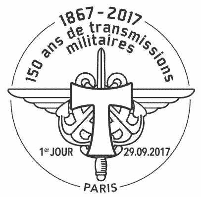 | Commentaire | Visuel : dès transmissions de 1867, aux transmissions par satellites de 2017, pour les trois armes représentées par l'avion Rafale, fleuron de notre force aérienne, un croiseur de la nouvelle génération et le char Leclerc de l'armée de Terre. TàD : 1867-2017 - le logo des 150 ans de Transmissions Militaires au sein des 3 Armes : Le "T" des Transmissions, les Ailes stylisées de "l'épervier" de l'Armée de l'Air française, les Ancres de la Marine Nationale et l'Epée, symbole de l'Armée de Terre. |