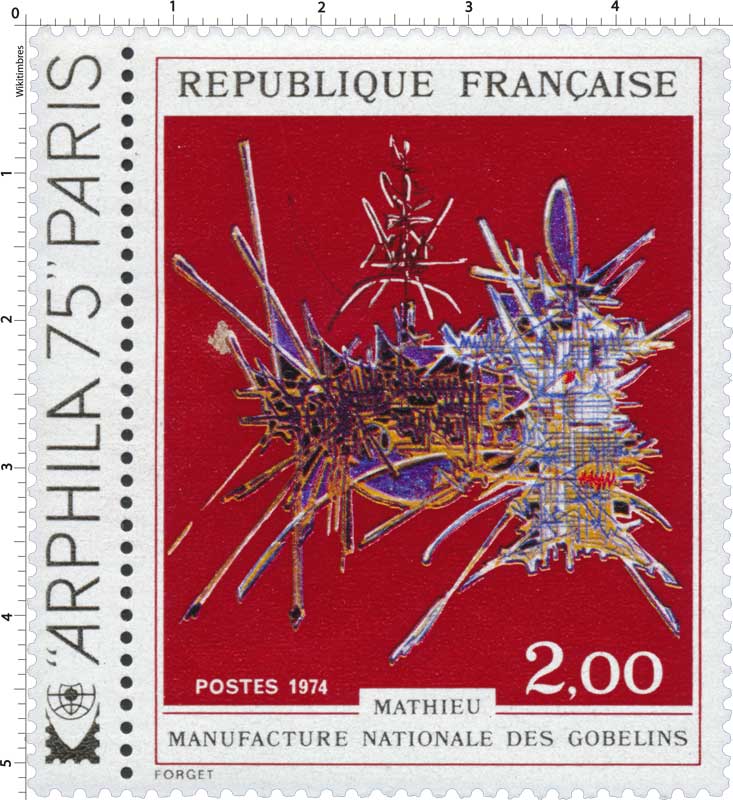 Timbre : 1974 MATHIEU MANUFACTURE NATIONALE DES GOBELINS ARPHILA 75 PARIS