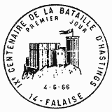 | Description | 9e centenaire de la bataille d'Hastings. Le château de Falaise et la statue de Guillaume le Conquérant, duc de Normandie |