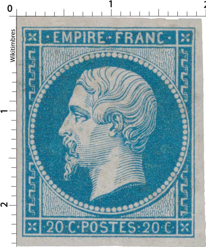 Napoléon III - Empire Franc. Type II. Remplacement par un 20 centimes bleu presque identique au type 2[2] rempl. le 12 août 1862