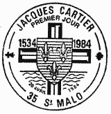 | Commentaire | Visuel - France + Canada : Jacques Cartier, un de ses deux voiliers + la croix, portant les armes anciennes de Saint-Malo à fleurs de lys (réplique de la croix dressée par le navigateur en 1534) + le "manoir de Limoëlou" (de J. Cartier) à Rothéneuf + l'écusson avec un Chien du Guet, symboles de Saint-Malo. |