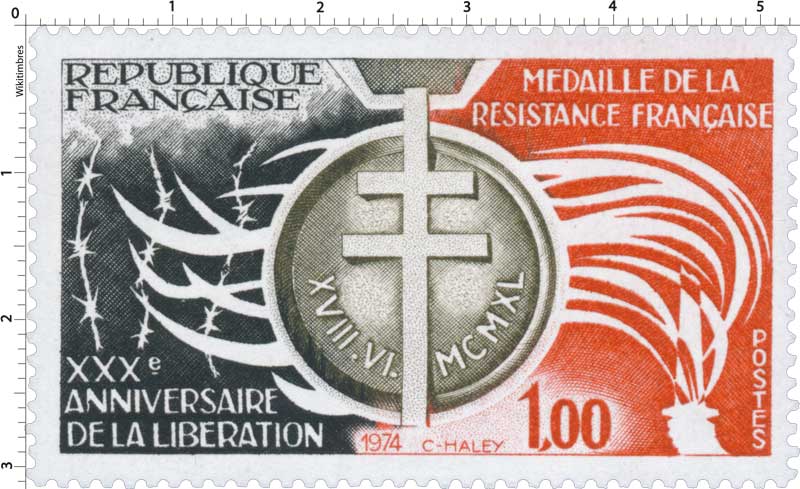 Timbre : 1974 XXXE ANNIVERSAIRE DE LA LIBÉRATION MÉDAILLE DE LA RESISTANCE FRANÇAISE