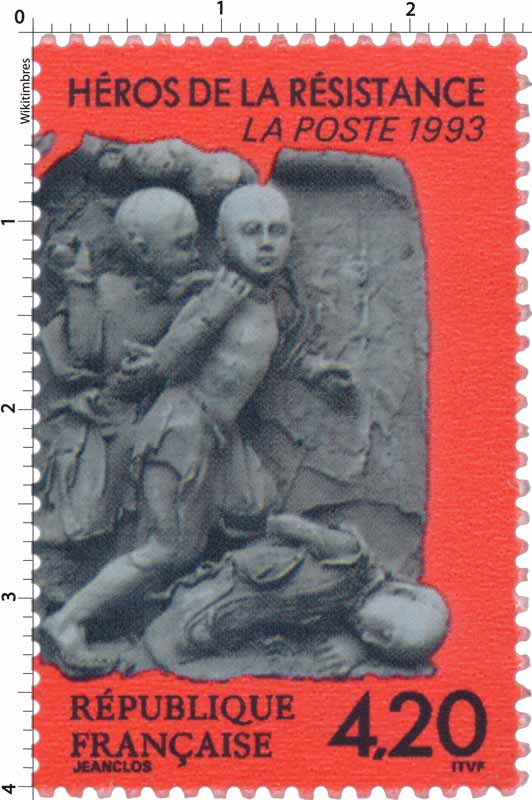 Timbre : 1993 HÉROS DE LA RÉSISTANCE Mesures Format d'imp 24 x 37 mm Dents incluses 26 x 40 mm Forme vertical Phosphore Non Impression héliogravure Complément sans marges blanches Couleur noir, et gris sur rouge Valeur 4 F 20 c Dentelure 13 Emis en Feuille de 25 diptyques Quantité 5 676 802 Auteurs Dessinateur xxxxx Graveur xxxxx Mise en page Michel Durand-Mégret Mentions D'après un bas-relief de Georges Jeanclos Numéros & Dates N° Philatelix 2957 N° Michel 2960 Date d'émission 21/06/1993 Date de retrait 15/04/1994 Classements Groupe Diptyque Martyrs et Héros de la Résistance 1993 Catégorie Timbres poste Familles résistance histoire Usage lettres de 2ème échelon jusqu'au 4 juillet 1993 Régions - Départements - Description Martyrs et Héros de la Résistance, d'après un bas-relief de Georges Jeanclos (1933-1997), né à Paris Commentaire - Mes timbres & notes personnelles www.wikitimbres.fr