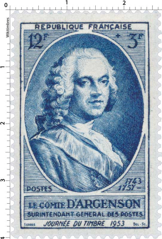 - Journée du timbre 1953. Pierre-Marc comte d'Argenson (1696-1764), surintendant général des postes de 1743 à 1757, né à Paris