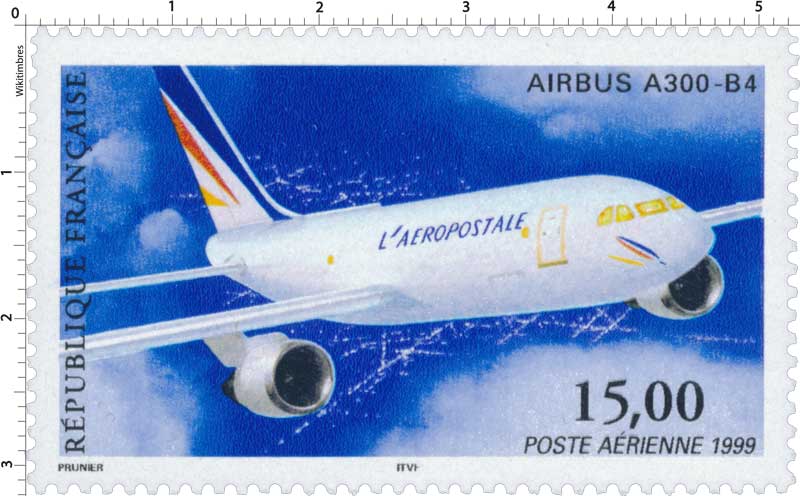 - Description synthétique du visuel du timbre : Faisant suite au Bréguet XIV (programme 1997) et au Potez 25 (programme 1998) qui rendaient hommage à l’époque héroïque de l’aviation postale, l’Airbus A300 - B4 ici représenté symbolise la modernité et le dynamisme actuel et futur de l’Aéropostale. La scène, clin d’œil