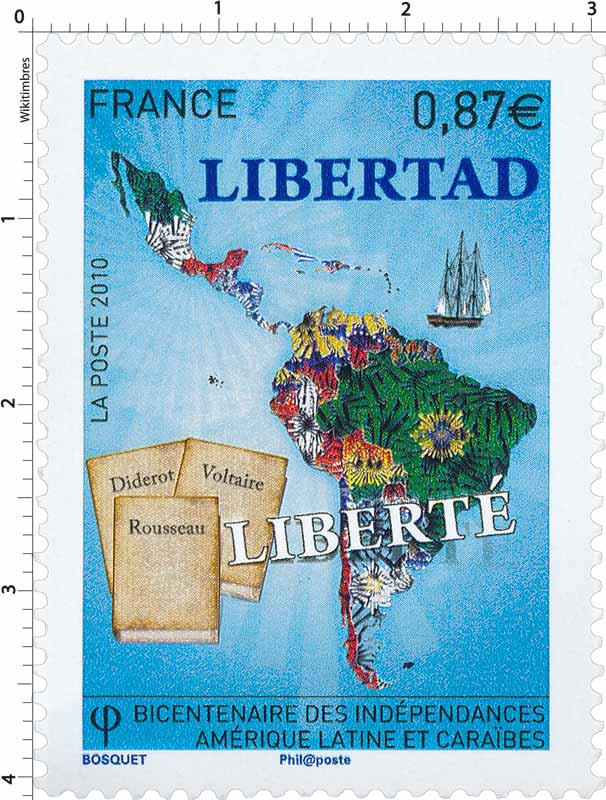 Timbre : 2010 LIBERTAD LIBERTÉ Bicentenaire des Indépendances Amérique Latine et Caraïbes