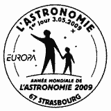 | Commentaire | La mise en vente anticipée a lieu le 3 mai au Parlement européen à Strasbourg et à la Cité de l'espace à Toulouse. Aurélie Baras dessine le timbre à date premier jour : un adulte et un enfant stylisés observent les étoiles dans le ciel. L’Unesco a déclaré 2009 année mondiale de l’astronomie. A cette occasion 104 pays organisent des actions pour mieux faire connaître l’astronomie et PostEurop a retenu l’Astronomie pour thème des timbres Europa 2009. Saturne et une exoplanète illustrent les 2 timbres, sur un fond stellaire, et pour évoquer toute l’histoire de l’astronomie, la lunette de Galilée, qui a marqué l’astronomie instrumentale, fait écho au télescope spatial COROT mis sur orbite en décembre 2006. Cette mission est la première expérience spatiale capable de découvrir des planètes extrasolaires telluriques et d'étudier des phénomènes et des objets jamais observés jusqu'à ce jour.. Certains détails du bloc seront recouverts d’une encre pailletée. |