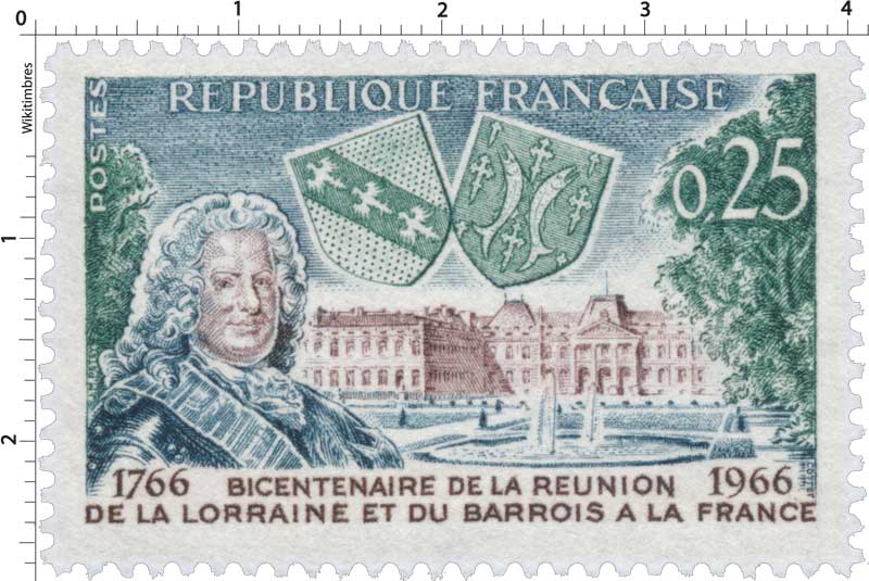 Timbre : BICENTENAIRE DE LA RÉUNION DE LA LORRAINE ET DU BARROIS A LA FRANCE 1766-1966