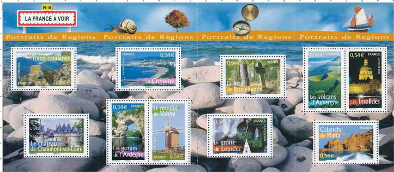 Portraits de Régions – LA FRANCE À VOIR N°8 La série philatélique Portraits de régions a été inaugurée en 2003. Elle célèbre la France, ses coutumes locales, ses traditions populaires, sa gastronomie, son architecture... Le 8e bloc rend hommage aux diverses régions de France à