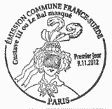 | Commentaire | L’émission commune entre la France et la Suède met à l’honneur l’Opéra Garnier de Paris et l’Opéra de Stockholm. Gustave III, roi de Suède de 1771 à 1792, grand francophile, à qui Louis XVI a cédé l’île de Saint-Barthélemy (rétrocédée à la France en 1878 et rattachée à la Guadeloupe dont elle devient une commune en 1946) fut assassiné en 1792. Un opéra créé par Daniel Auber, Le Bal masqué, retrace et met en scène les dernières heures de Gustave III. Le 1er timbre reprend un portrait de Daniel Auber, le 2e évoque le ballet. Le fond de bloc, quant à lui, représente l’escalier d’honneur de l’Opéra Garnier.