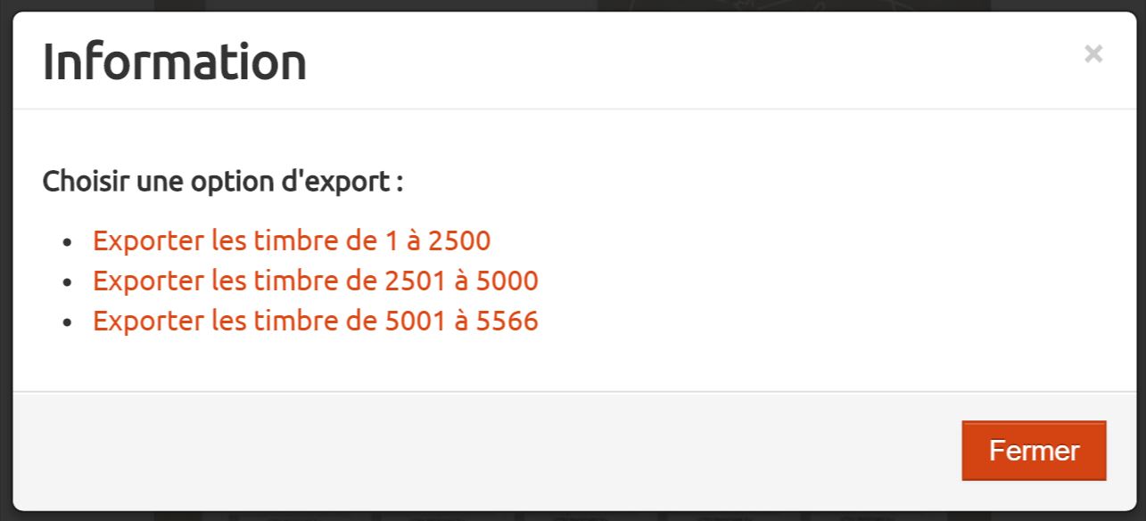 Lorsque la sélection était trop importante > 3000 timbres, l'excel ne pouvait être généré, Dorénavant l'export de la collection est découpé en tranches de 2500 timbres. L'export devient donc illimité ! ! ! Exemple : pour une collection de 5566 timbres :