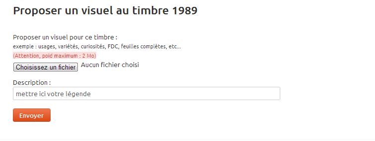 Il sert à enrichir le diaporama sous le timbre "voir les autres visuels" l'utilité du diaporama est de créer un environnement autour du timbre présenté. Si vous possédez un élément qui peut apporter un plus, vous pouvez le scanner et l'envoyer en ajoutant une légende. Exemple : des curiosités, variétés, usages, des 1ers jours etc.