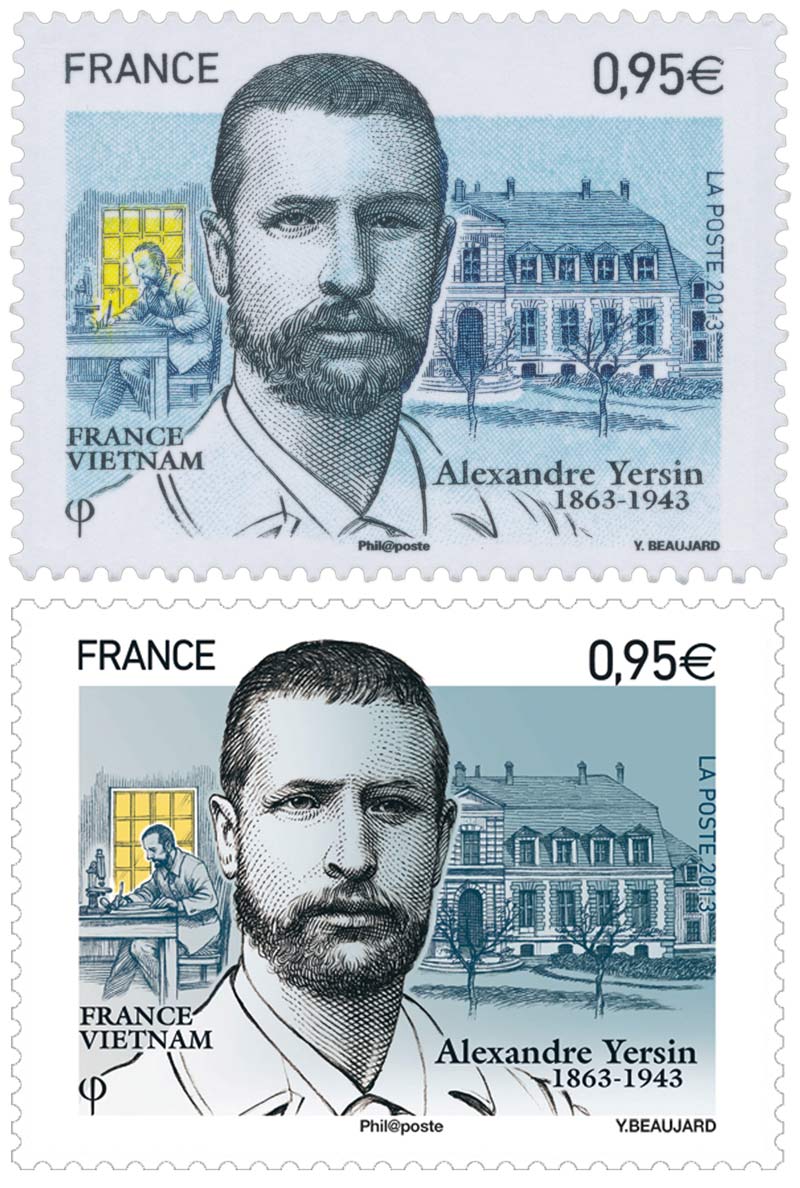 Les scans sont réalisés de façon rigoureuse et professionnelle, le but est de présenter le plus possible des timbres aux "couleurs vraies" (1) pouvant ainsi réellement donner une information sur la chromie, et non comme sur tous les autres sites des images théoriques de maquettes surcolorisées distribuées par La Poste en RVB (qui n'ont rien à voir avec la réalité) Exemple : le scan ci-dessous et sa version officielle en dessous (boutique web du timbre et autres sites) à part les couleurs très différentes, on a la nette impression qu'Alexandre Yersin a eu le temps de se passer un coup de peigne entre les deux versions, sans compter les nombreuses différences comme la bande blanche sous les escaliers etc. Conclusion : pour les visuels il est préférable de se fier à un scan |