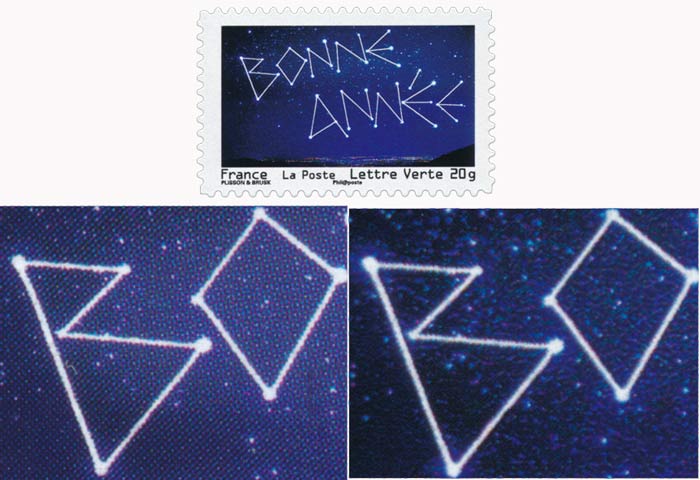 Exemple : pour le timbre ci-dessous l'utilité de l'agrandissement est évidente à gauche en offset, planche de 50 TP à droite en héliogravure, carnet de 12 TP Grossissement :
