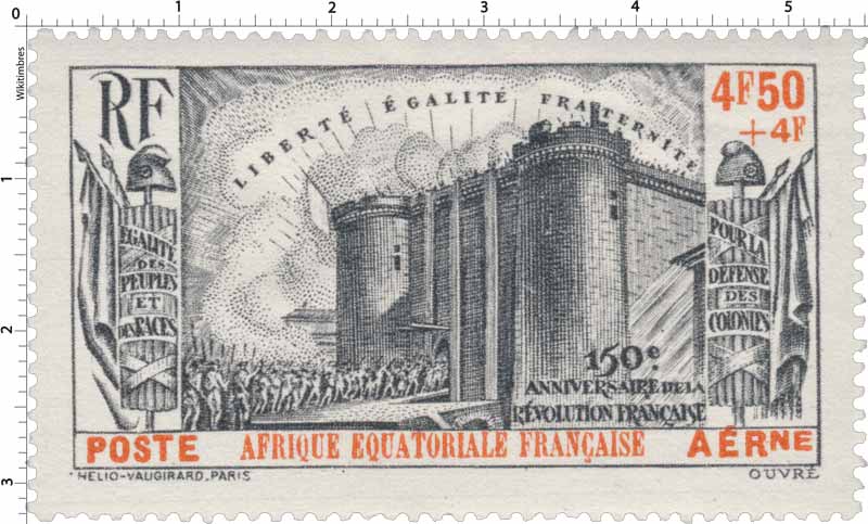 Timbre : 150e anniversaire de la Révolution française Mesures Format d'imp 57 x 34 mm Dents incluses - Forme horizontal Phosphore Non Impression - Complément - Couleur noir Valeur 4.50 F + 4.00 F Dentelure 13 1/2 x 13 Emis en - Quantité - Auteurs Dessinateur - Graveur - Mise en page - Mentions - Numéros & Dates N° Philatelix - N° Michel - Date d'émission 01/01/1939 Date de retrait - Classements Groupe AEF - 150e anniversaire de la Révolution française Catégorie Poste Aérienne Familles fortifications constructions patrimoine Usage - Ancienne colonie AEF Description 150ème anniversaire de la Révolution française Commentaire - Mes timbres & notes personnelles www.wikitimbres.fr