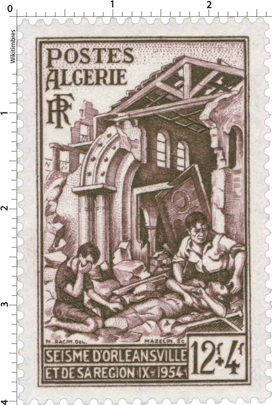 Timbre : Algérie - Séisme d'Orléansville et de sa région 1954 Mesures Format d'imp - Dents incluses - Forme vertical Phosphore - Impression Taille-douce Complément - Couleur brun-lilas Valeur 12 F Dentelure 13 Emis en feuille de 25 TP Quantité - Auteurs Dessinateur Mohamed Racim Graveur Charles Mazelin Mise en page - Mentions - Numéros & Dates N° Philatelix - N° Michel - Date d'émission 05/12/1954 Date de retrait - Classements Groupe Algérie - Séisme d'Orléansville 1954 Catégorie Timbres poste Familles Catastrophes humanitaire société Usage - Ancienne colonie Algérie Description Emis au profit des sinistrés du séisme d'Orléansville et de sa région Commentaire - Mes timbres & notes personnelles www.wikitimbres.fr