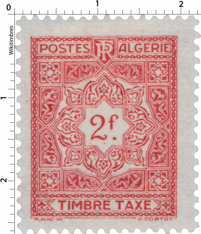 Timbre : Algérie - Mosaïques Mesures Format d'imp - Dents incluses - Forme vertical Phosphore - Impression - Complément - Couleur carmin Valeur 2 F Dentelure 14 x 13 1/2 Emis en - Quantité - Auteurs Dessinateur - Graveur - Mise en page - Mentions - Numéros & Dates N° Philatelix - N° Michel - Date d'émission 01/01/1947 Date de retrait - Classements Groupe Algérie - Taxe mosaïques Catégorie Taxe Familles mosaïques objet / art patrimoine Usage - Ancienne colonie Algérie Description Mosaïques Commentaire - Mes timbres & notes personnelles www.wikitimbres.fr