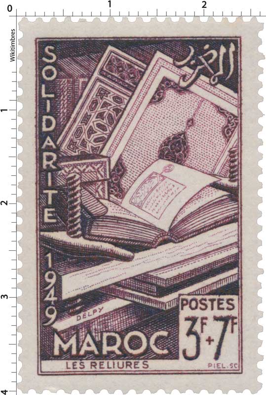 Timbre : 1950 Maroc - Reliures Mesures Format d'imp - Dents incluses - Forme vertical Phosphore - Impression - Complément - Couleur - Valeur - Dentelure - Emis en - Quantité - Auteurs Dessinateur - Graveur - Mise en page - Mentions - Numéros & Dates N° Philatelix - N° Michel - Date d'émission 01/01/1950 Date de retrait - Classements Groupe Maroc - Au profit des Oeuvres de solidarité 1950 Catégorie Timbres poste Familles Usage - Ancienne colonie Maroc (en cours) Description - Commentaire - Mes timbres & notes personnelles www.wikitimbres.fr