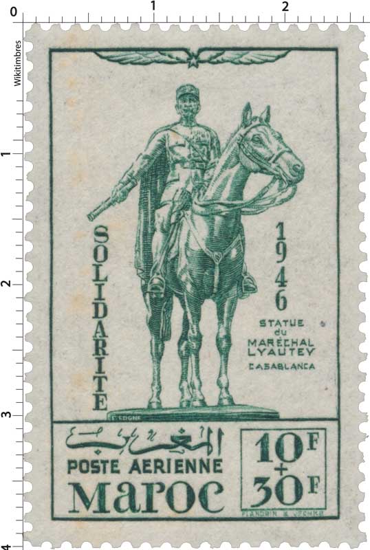 Timbre : 1946 Maroc - Statue du Maréchal Lyautey - Casablanca Mesures Format d'imp - Dents incluses - Forme vertical Phosphore - Impression - Complément - Couleur - Valeur - Dentelure - Emis en - Quantité - Auteurs Dessinateur - Graveur - Mise en page - Mentions - Numéros & Dates N° Philatelix - N° Michel - Date d'émission 01/01/1946 Date de retrait - Classements Groupe Maroc - Statue équestre de Lyautey Catégorie Poste Aérienne Familles Usage - Ancienne colonie Maroc (en cours) Description - Commentaire - Mes timbres & notes personnelles www.wikitimbres.fr