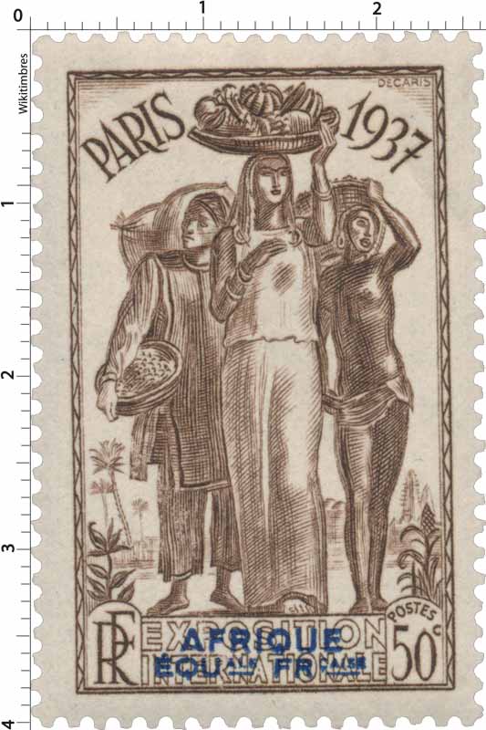 Timbre : 1937 Exposition internationale Paris AFRIQUE EQUale FRçaise Mesures Format d'imp 22 x 36 mm Dents incluses 26 x 40 mm Forme - Phosphore Non Impression - Complément - Couleur brun et bleu Valeur 50 c Dentelure 13 Emis en - Quantité - Auteurs Dessinateur - Graveur - Mise en page - Mentions - Numéros & Dates N° Philatelix - N° Michel - Date d'émission 01/01/1937 Date de retrait 00/00/0000 Classements Groupe AEF - Exposition internationale de 1937 Catégorie Timbres poste Familles expositions - foire festivités Usage - Ancienne colonie AEF Description Exposition internationale de Paris Commentaire - Mes timbres & notes personnelles www.wikitimbres.fr