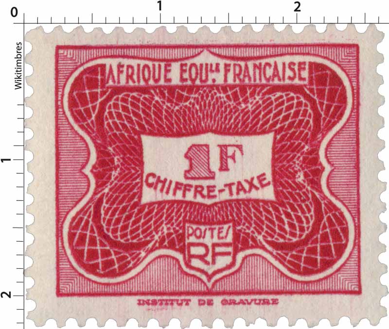 Timbre : Chiffre taxe Afrique Équatoriale Française Mesures Format d'imp 22 x 18 mm Dents incluses 26 x 22 mm Forme horizontal Phosphore Non Impression - Complément - Couleur rose-carmin Valeur 1.00 F Dentelure 13 Emis en - Quantité - Auteurs Dessinateur - Graveur - Mise en page - Mentions - Numéros & Dates N° Philatelix - N° Michel - Date d'émission 01/01/1947 Date de retrait - Classements Groupe AEF - Chiffre taxe Catégorie Taxe Familles Chiffre Taxe burelé type Usage - Ancienne colonie AEF Description Taxe Commentaire - Mes timbres & notes personnelles www.wikitimbres.fr