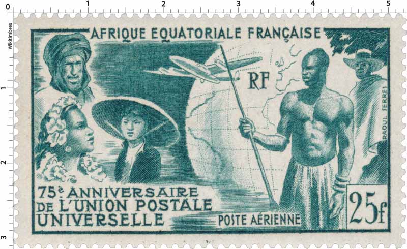 Timbre : 75ème anniversaire de l'Union Postale Universelle poste aérienne Mesures Format d'imp 48 x 26 mm Dents incluses 52 x 30 mm Forme - Phosphore Non Impression - Complément - Couleur vert-bleu Valeur 25.00 F Dentelure 13 Emis en - Quantité - Auteurs Dessinateur - Graveur - Mise en page - Mentions - Numéros & Dates N° Philatelix - N° Michel - Date d'émission 01/01/1949 Date de retrait - Classements Groupe - Catégorie Poste Aérienne Familles personnages Usage - Ancienne colonie AEF Description 75ème anniversaire de l'Union Postale Universelle Commentaire - Mes timbres & notes personnelles www.wikitimbres.fr
