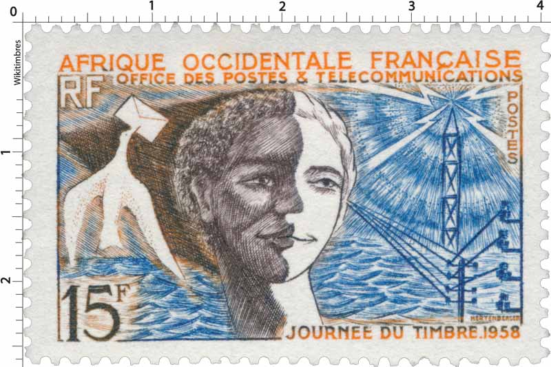 Timbre : Afrique Occidentale Française - Journée du timbre 1958 Mesures Format d'imp - Dents incluses - Forme - Phosphore - Impression - Complément - Couleur bleu, orange et brun-violet Valeur - Dentelure - Emis en - Quantité - Auteurs Dessinateur - Graveur - Mise en page - Mentions - Numéros & Dates N° Philatelix - N° Michel - Date d'émission 01/01/1958 Date de retrait - Classements Groupe - Catégorie Timbres poste Familles Usage - Ancienne colonie AOF Description Journée du timbre Commentaire - Mes timbres & notes personnelles www.wikitimbres.fr