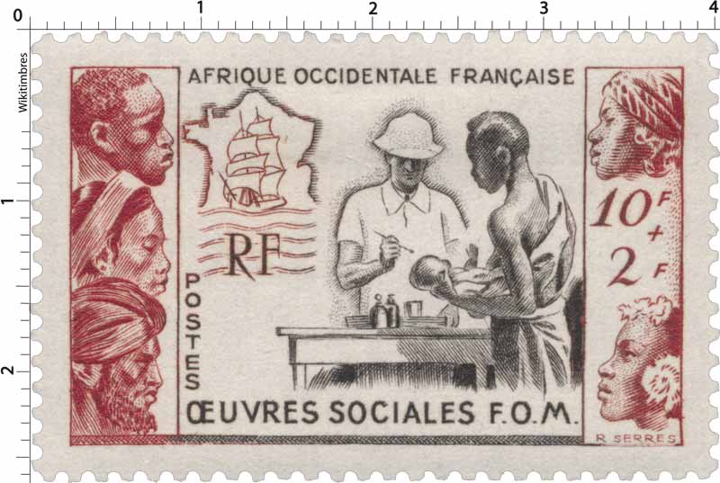 Timbre : Afrique Occidentale Française Oeuvres sociales FOM Mesures Format d'imp - Dents incluses - Forme horizontal Phosphore - Impression - Complément - Couleur brun-rouge eet brun-noir Valeur - Dentelure - Emis en - Quantité - Auteurs Dessinateur - Graveur - Mise en page - Mentions - Numéros & Dates N° Philatelix - N° Michel - Date d'émission 01/01/1950 Date de retrait - Classements Groupe - Catégorie Timbres poste Familles Usage - Ancienne colonie AOF Description - Au profit des Oeuvres sociales de la France d'Outre-Mer Commentaire - Mes timbres & notes personnelles www.wikitimbres.fr