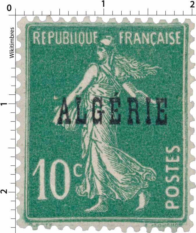 Timbre : Algérie - Type Semeuse Mesures Format d'imp - Dents incluses - Forme vertical Phosphore - Impression typographie à plat Complément - Couleur vert Valeur - Dentelure 14 x 13 1/2 Emis en feuille de 100 TP Quantité - Auteurs Dessinateur Oscar Roty Graveur Louis Eugène Mouchon retouché par Jean-Baptiste Lhomme Mise en page - Mentions - Numéros & Dates N° Philatelix - N° Michel - Date d'émission 01/01/1925 Date de retrait - Classements Groupe Algérie - Semeuse Catégorie Timbres poste Familles semeuse type Usage - Ancienne colonie Algérie Description Type Semeuse Commentaire - Mes timbres & notes personnelles www.wikitimbres.fr