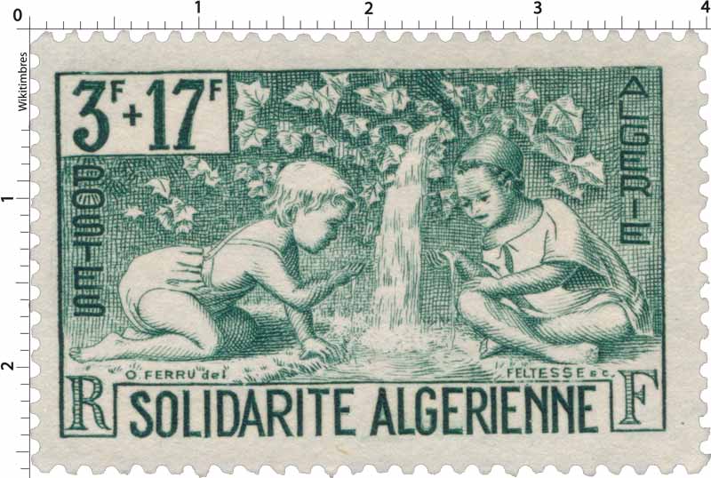 Timbre : Algérie - Solidarité Algérienne Mesures Format d'imp - Dents incluses - Forme horizontal Phosphore - Impression Taille-douce Complément - Couleur vert Valeur 3 F Dentelure 13 Emis en feuille de 25 TP Quantité - Auteurs Dessinateur O.Ferru Graveur Emile Feltesse Mise en page - Mentions - Numéros & Dates N° Philatelix - N° Michel - Date d'émission 02/10/1946 Date de retrait - Classements Groupe Algérie - Solidarité Algérienne 1946 Catégorie Timbres poste Familles Usage - Ancienne colonie Algérie Description Solidarité Algérienne Commentaire - Mes timbres & notes personnelles www.wikitimbres.fr