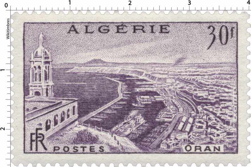 Timbre : Algérie - Oran et son port Mesures Format d'imp - Dents incluses - Forme horizontal Phosphore - Impression Taille-douce Complément - Couleur violet Valeur 30 F Dentelure 13 Emis en feuille de 25 TP Quantité - Auteurs Dessinateur Henry Cheffer Graveur Henry Cheffer Mise en page - Mentions - Numéros & Dates N° Philatelix - N° Michel - Date d'émission 10/12/1956 Date de retrait - Classements Groupe Algérie - Oran et son port Catégorie Timbres poste Familles Usage - Ancienne colonie Algérie Description Vue d'Oran Le port et la Ville d’Oran vues du Mont de Murdjadjo Commentaire - Mes timbres & notes personnelles www.wikitimbres.fr