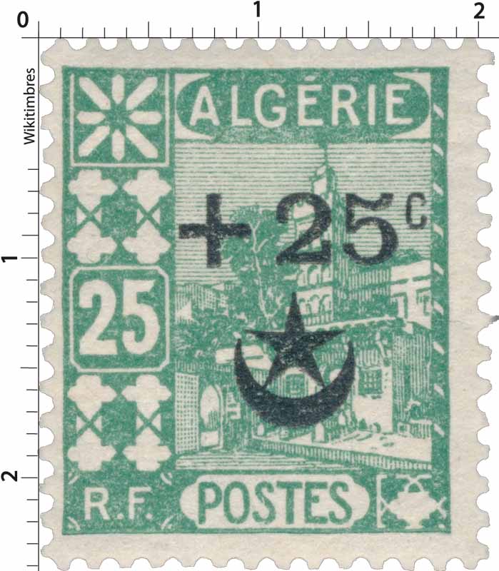 Timbre : Algérie - Mosquée Sidi Abderahmane Mesures Format d'imp - Dents incluses - Forme vertical Phosphore - Impression typographie à plat Complément - Couleur vert Valeur 25 c Dentelure - Emis en feuille de 150 TP Quantité 50 000 Auteurs Dessinateur Montader Graveur Montader Mise en page - Mentions - Numéros & Dates N° Philatelix - N° Michel - Date d'émission 03/01/1927 Date de retrait - Classements Groupe Algérie - Mosquée Sidi Abderahmane Catégorie Timbres poste Familles église / mosquée / temple constructions patrimoine Usage - Ancienne colonie Algérie Description Mosquée Sidi Abderahmane. Au profit des soldats d'Algérie blessés au Maroc Commentaire - Mes timbres & notes personnelles www.wikitimbres.fr