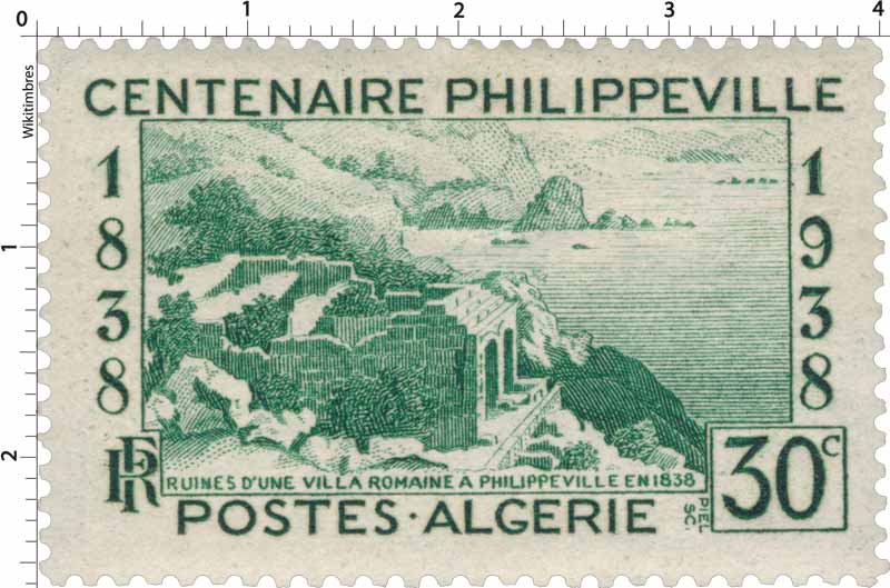 Timbre : Algérie - Ruine d'une villa romaine à Philippeville en 1838 - centenaire Philippeville Mesures Format d'imp - Dents incluses - Forme horizontal Phosphore - Impression Taille-douce Complément - Couleur vert Valeur 30 c Dentelure 14 x 13 1/2 Emis en feuille de 50 TP Quantité 530 000 Auteurs Dessinateur Jules Piel Graveur Jules Piel Mise en page - Mentions - Numéros & Dates N° Philatelix - N° Michel - Date d'émission 01/10/1938 Date de retrait - Classements Groupe Algérie - Ruines de Russicada Catégorie Timbres poste Familles archéologique patrimoine Usage - Ancienne colonie Algérie Description Golfe de Stora et ruines de Russicada Commentaire - Mes timbres & notes personnelles www.wikitimbres.fr