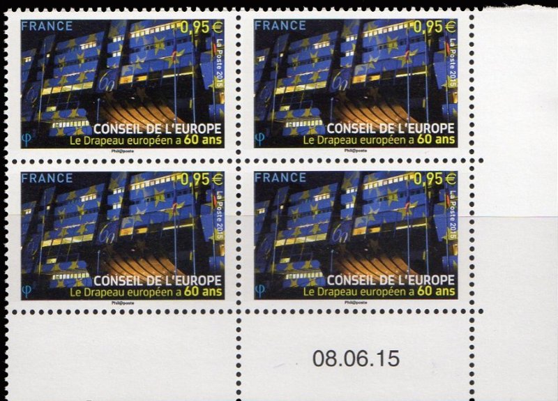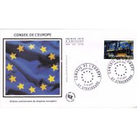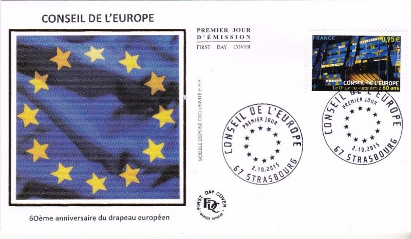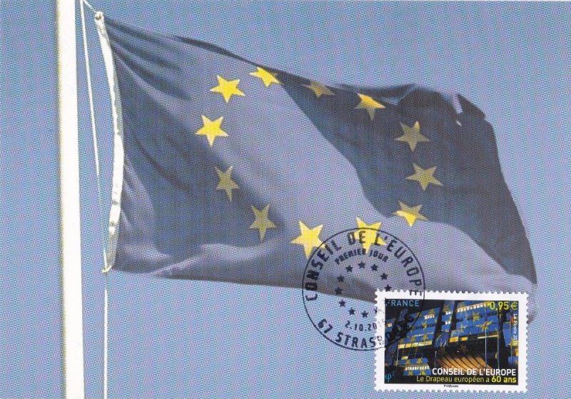 | Commentaire | Timbre à date “Premier Jour” mis en page par Aurélie Baras En savoir plus sur Wikipédia : drapeau européen Historique du drapeau : année 1950, la Communauté européenne du charbon et de l'acier (organisation ayant précédé la Communauté européenne et l'Union européenne) ne comprend que six États fondateurs : l'Allemagne de l'Ouest, la Belgique, la France, l'Italie, le Luxembourg et les Pays-Bas. Mais depuis 1949, il existe un autre organisme européen réunissant davantage de membres, le Conseil de l'Europe, qui veille notamment à défendre les Droits de l'homme et à promouvoir la culture européenne. Cherchant un symbole susceptible de le représenter, le Conseil charge le 18 août 1950, une commission, de traduire "les valeurs spirituelles et morales qui sont le patrimoine commun des peuples qui le composent". |
