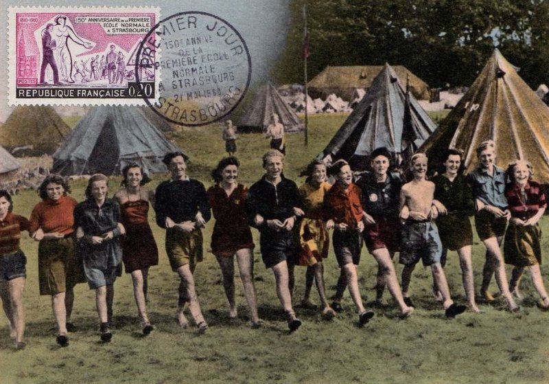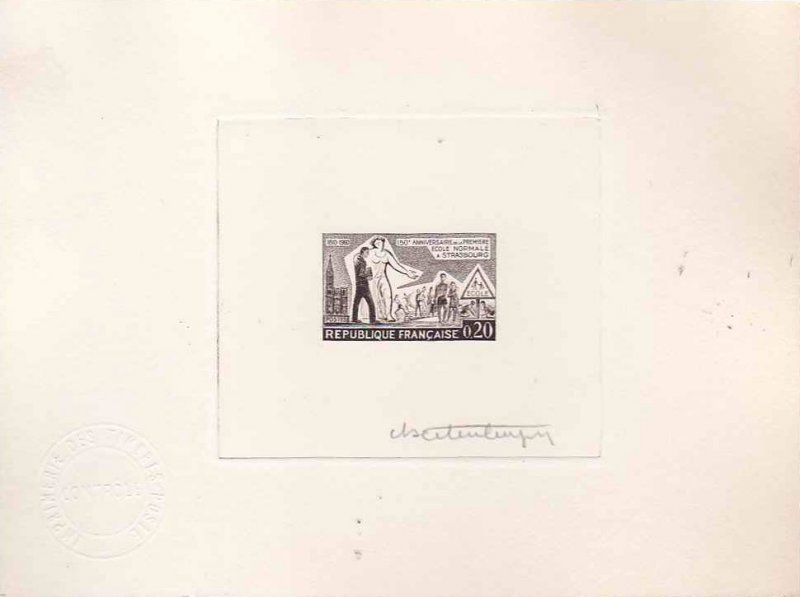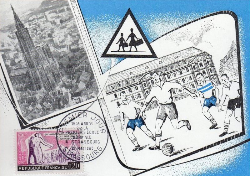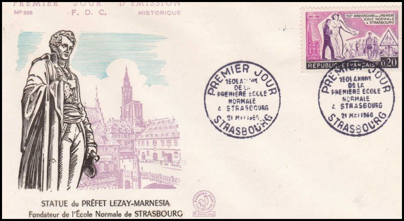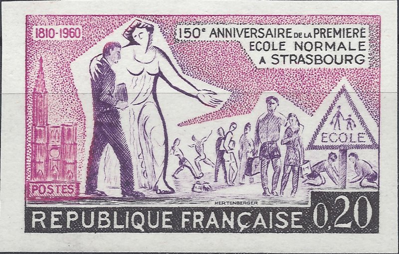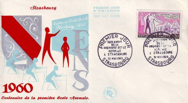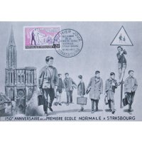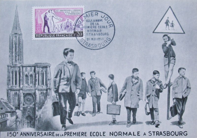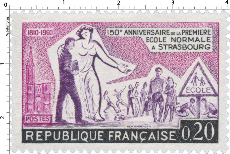 Timbre émis le 23 mai 1960 pour le 150e anniversaire de la première école normale primaire de France ouverte à Strasbourg.