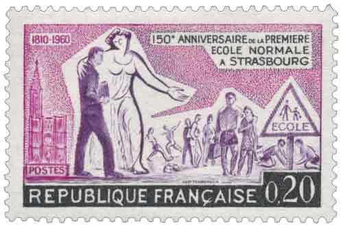 Timbre émis le 23 mai 1960 pour le 150e anniversaire de la première école normale primaire de France ouverte à Strasbourg.