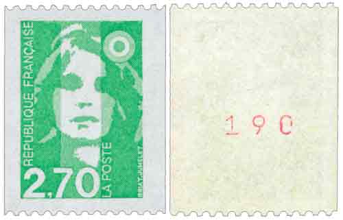 | Commentaire | Roulette de 1000 timbres-poste avec numérotation au dos en rouge tous les 5 timbres-poste. Le premier numéro est 000, le dernier est 005. Le timbre est imprimé sur un papier avec gomme mate, mais il existe imprimé sur papier avec gomme brillante. En savoir plus sur Wikipédia : Marianne du Bicentenaire |