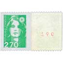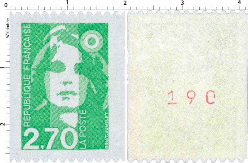 | Commentaire | Roulette de 1000 timbres-poste avec numérotation au dos en rouge tous les 5 timbres-poste. Le premier numéro est 000, le dernier est 005. Le timbre est imprimé sur un papier avec gomme mate, mais il existe imprimé sur papier avec gomme brillante. En savoir plus sur Wikipédia : Marianne du Bicentenaire |