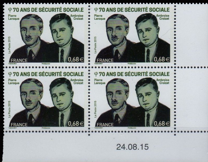 | Commentaire | En savoir plus sur Wikipédia : Ambroise Croizat Pierre Laroque Pierre Laroque, né le 2 nov. 1907 et décédé le 21 janv. 1997 à Paris. C'est un haut fonctionnaire français connu comme le "père" de la sécurité sociale de 1945. Admis au Conseil d'État en 1929, il doit à son entrée en 1931 au cabinet d'Adolphe Landry (1874-1956), ministre du Travail et de la Prévoyance sociale (20 janv.1931 à 19 fév.1932, de devenir un spécialiste des assurances sociales. Ambroise Croizat, né le 28 janv. 1901 à Notre-Dame-de-Briançon (73-Savoie) et décède le 11 fév.1951 à Suresnes (92-Hts-de-Seine). Il fut l'un des fondateurs de la sécurité sociale et du système des retraites en France. Il est également secrétaire général de la Fédération CGT des travailleurs de la métallurgie et Ministre du travail et de la Sécurité sociale du Général de Gaulle du 21 nov.1945 au 4 mai 1947. |