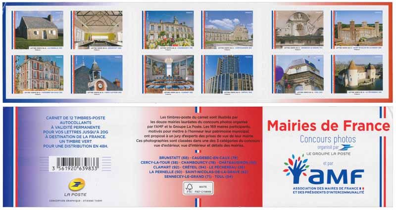 | Commentaire | Initialement prévu le 21 novembre 2015 mais supprimé suite aux événements du 13 novembre Représentation des mairies de : Brunstatt (68) ; Caudebec-en-Caux (76) ; Cercy-La-Tour (58) ; Chambourcy (78) ; Châteaugiron (35) ; Clamart (92) ; Créteil (94) ; La Pernelle (50) ; Le Pêchereau (36) ; Saint-Nicolas-de-la-Grave (82) ; Sennecey-Le-Grand (71) ; Toul (54) À l’issue d’un concours national visant à valoriser la richesse du patrimoine municipal de France, à partir de photographies proposées par les maires, 12 d’entre eux ont été sélectionnés pour composer un carnet de 12 beaux-timbres destiné à "Nos belles mairies de France", qui sera émis sur l’ensemble du territoire. L’Association des Maires de France et des Présidents d’Intercommunalité (AMF) ont choisi les photos pour illustrer le carnet |