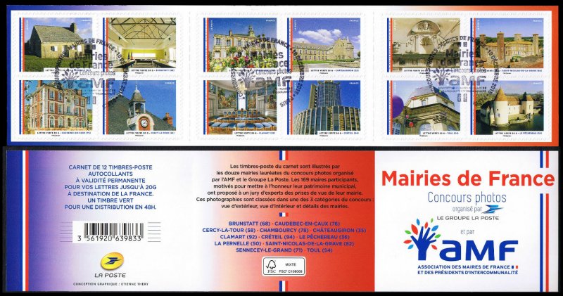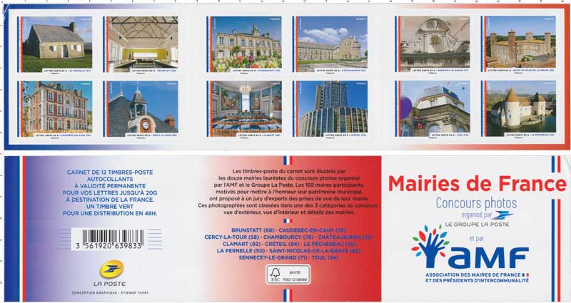 | Commentaire | Initialement prévu le 21 novembre 2015 mais supprimé suite aux événements du 13 novembre Représentation des mairies de : Brunstatt (68) ; Caudebec-en-Caux (76) ; Cercy-La-Tour (58) ; Chambourcy (78) ; Châteaugiron (35) ; Clamart (92) ; Créteil (94) ; La Pernelle (50) ; Le Pêchereau (36) ; Saint-Nicolas-de-la-Grave (82) ; Sennecey-Le-Grand (71) ; Toul (54) À l’issue d’un concours national visant à valoriser la richesse du patrimoine municipal de France, à partir de photographies proposées par les maires, 12 d’entre eux ont été sélectionnés pour composer un carnet de 12 beaux-timbres destiné à "Nos belles mairies de France", qui sera émis sur l’ensemble du territoire. L’Association des Maires de France et des Présidents d’Intercommunalité (AMF) ont choisi les photos pour illustrer le carnet |