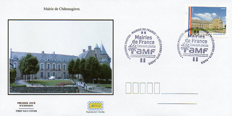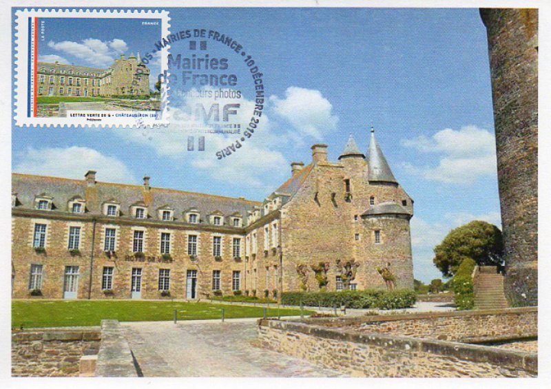 | Commentaire | Initialement prévu le 21 novembre 2015 mais supprimé suite aux événements du 13 novembre 2015 Mairie de CHÂTEAUGIRON (région Bretagne, 35 - Ille-et-Vilaine / arrondissement de Rennes) © Karine Guyot Le Château datant du 14ème au 18ème accueille aujourd'hui l'Hôtel de ville. La ville recèle des trésors d'architecture de tous styles : château (XIIe au XVIIIe siècles), maisons anciennes du centre et constructions plus récentes (les Halles, l'Eglise, le Prieuré Sainte-Croix). Le château : de l'ancienne forteresse médiévale, rénovée entre 1450 et 1470 par Jean de Malestroit, dit "de Derval" subsistent d'importants vestiges. Il comptait 6 tours, un châtelet d'entrée avec un pont levis et le logis seigneurial. La partie la plus ancienne est constituée par le chœur de la chapelle castrale de style roman (XIIIe). Quatre tours se dressent encore : le donjon (XIIIe au XVe siècle) à l'origine indépendant du château, haut de 38 mètres, la tour de l'Horloge (XIVe au XVe) servit de beffroi pendant l'Ancien Régime, les tours du Guet et du Cardinal (XVe) furent sans doute édifiées par Jean de Derval et ont conservé leur chemin de ronde sur mâchicoulis. Les transformations effectuées par la famille Le Prestre au XVIIIe consistèrent à remodeler et agrandir le logis médiéval dans un style d'architecture à la française. L'une des tours d'angle de l'ancien logis fut démolie pour laisser place à un pavillon avec galerie en bois qui se continuait sur l'ancien chemin de ronde. De grands jardins furent aménagés à l'Est et l'ancien châtelet d'entrée qui permettait l'accès au château depuis la ville fut lui aussi remanié dans un ensemble de bâtiments aujourd'hui disparus.