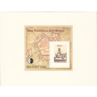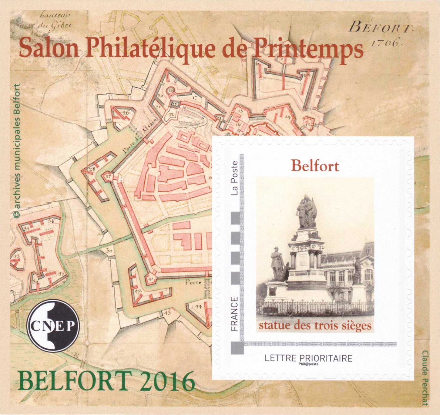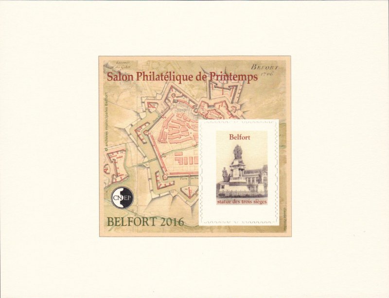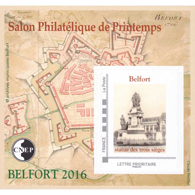 Blocs de la CNEP (Chambre syndicale française des Négociants et Experts en Philatélie) du 36e Salon Philatélique de Printemps "Belfort 2016" Visuel : un plan aquarellé des fortifications de Belfort en 1706 + un ID Timbre de la "Statue des Trois Sièges" à Belfort