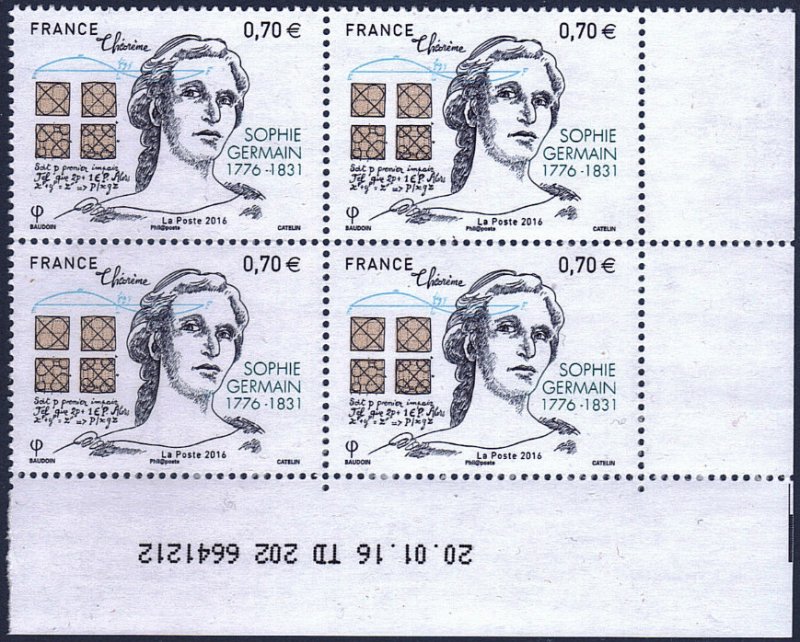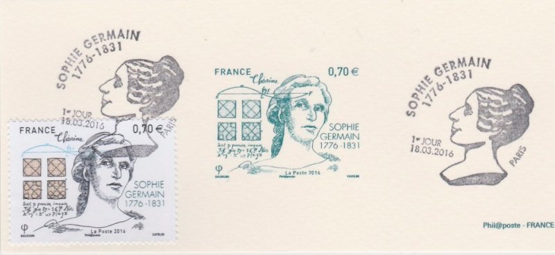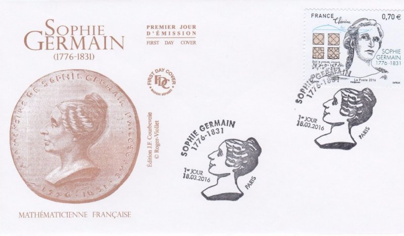 Marie-Sophie Germain, née le 1er avril 1776 à Paris une femme mathématicienne du XVIIIe siècle qui a lutté contre la société de son temps pour imposer ses travaux. Ses contributions principales aux mathématiques, portent sur la théorie des nombres et sur les déformations élastiques. Elle décède à Paris le 27 juin 1831, des suites d'un cancer, et est inhumée au cimetière du Père-Lachaise, dans la 16e division.