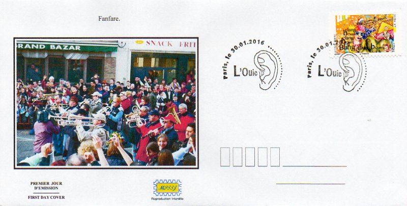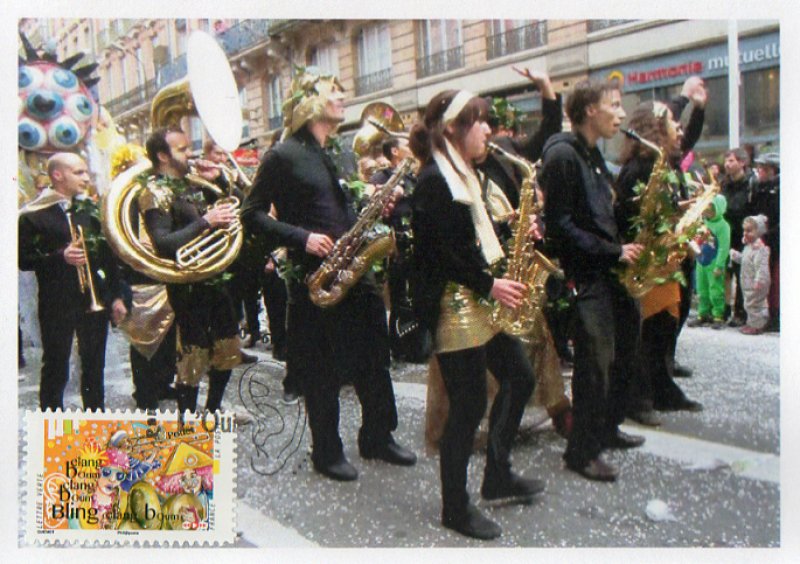 | Commentaire | La musique d'une fanfare au carnaval : la fanfare peut désigner différentes composition musicale ou divers ensembles de musiciens de la famille des cuivres (instruments à vent, dont le son est produit par vibration des lèvres dans une embouchure) parfois accompagnés de percussions (frappe ou grattage d'une membrane avec un matériau résonnant). Les fanfares restent des ensembles instrumentaux qui ponctuent les moments forts de la vie d’une communauté. Pour les musiciens et le publique, il faut se protéger contre le bruit intense provoqué par une fanfare, afin de protéger son potentiel auditif. |