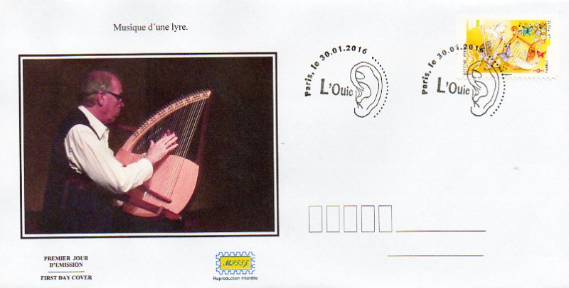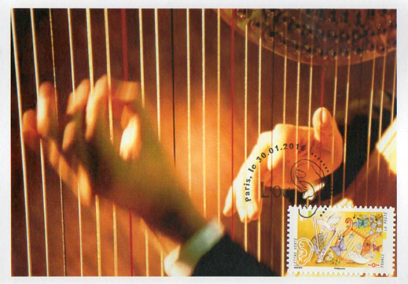 | Commentaire | La musique d'une harpe et d'une lyre : la harpe est le plus ancien instrument à cordes pincées. C’est un instrument merveilleux capable de mélodie et de polyphonie. De forme le plus souvent triangulaire, muni de cordes tendues de longueurs variables dont les plus courtes donnent les notes les plus aiguës. Chaque corde peut jouer trois hauteurs : bémol si la pédale est relâchée (= en haut), bécarre si elle est bloquée sur le cran du milieu et dièse si elle est tout à fait enfoncée. C'est un instrument asymétrique, contrairement à la lyre dont les cordes sont tendues entre deux montants parallèles. La lyre était populaire dans les civilisations antiques, son nombre de cordes, limité de 5 à 8, réduisait l'instrument à un rôle symbole d'accompagnement de la chanson et de la poésie. |