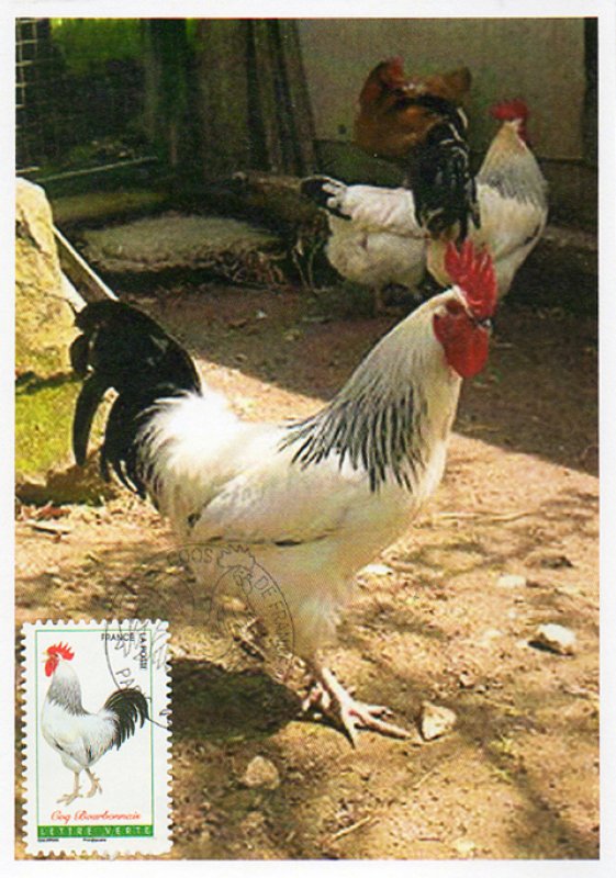 | Commentaire | Coq Bourbonnais (Auvergne) : le Bourbonnais est une ancienne province française à la limite Nord du Massif Central. Il fut créé et agrandi par la famille des Bourbons et devînt un duché en 1327. Le département de l´Allier actuel correspond peu ou prou à son ancien découpage. On trouvait donc dans ses vallées et celles de la Loire beaucoup de poules blanches pratiquement à l´état naturel. Ces gélines croisées avec des coqs Brahma (volaille géante d'origine asiatique, créée aux États-Unis à partir de Cochin auquel du sang de combattant Malais a été ajouté, puis importée en Europe occidentale entre 1850 et 1860) permirent d’obtenir une race baptisée Bourbonnaise, faisant évoluer son plumage en blanc herminé (plumage blanc avec des traces noires aux ailes, au camail, à la queue (rectrice). Caractéristiques : plumage : blanc herminé de noir – poids : 3,5 kg – crête : simple – oreillons : rouges – yeux : rouge orangé – Ø des bagues : 20 mm |