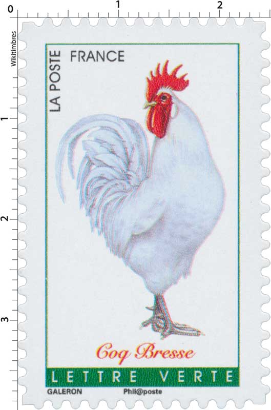 Coq de Bresse (Ain, Saône-et-Loire et Jura) : la Bresse-Gauloise, sélectionnée selon le standard de la Société Centrale d'Aviculture de France, afin de concourir dans les expositions nationales et internationales. Dans l'agriculture, la Bresse-Gauloise à plumage blanc constitue les cheptels servant à produire le poulet de Bresse (poulet, poularde et chapon – AOC depuis 1957). La volaille de Bresse est produite dans un terroir assez limitée (100 km sur 40 km) : Bourg-en-Bresse, Pont-de-Vaux et Montrevel-en-Bresse