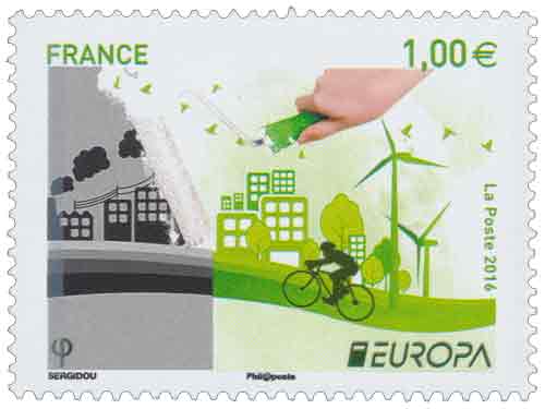 | Commentaire | L'émission Europa (nommée Europa - CEPT jusqu'en 1992) est une émission conjointe annuelle de Timbres-Poste sur une même illustration ou un même thème par les Administrations Postales membres des Communautés Européennes (1956-1959), de la Conférence Européenne des administrations des Postes et Télécommunications (CEPT), créée à Montreux (Suisse) le 26 juin 1959, puis de l'association PostEurop depuis 1993, avec son siège à Bruxelles (Belgique). "Think Green" ou "L'Écologie en Europe - Penser Vert" est le thème choisi par PostEurop pour 2016. A l'occasion du 60e anniversaire de timbres Europa, PostEurop a décidé d'avoir une conception commune pour tous ses États membres et a organisé un concours qui a été remporté par Doxia Sergidou de Chypre post. SERGIDOU Doxia : elle est l'artiste chypriote, gagnante du concours PostEurop, auteur du timbre qui décrit bien l'idée du "Think Green". Visuel du TP : il évoque un paysage dichotomique : un côté gauche gris et pollué, l'autre, de couleur verte, évoquant un environnement sain et durable pour la planète et les humains. |