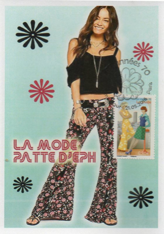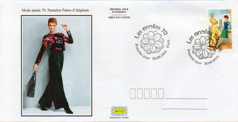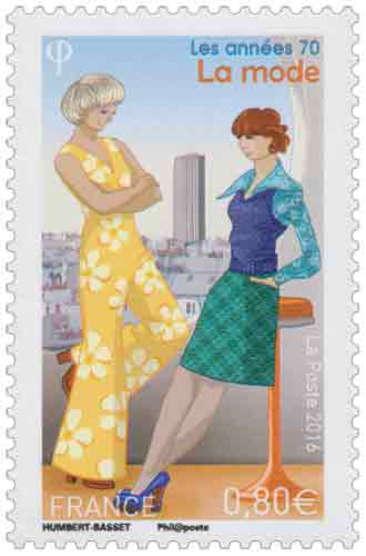 | Commentaire | Timbre à date “Premier Jour” conçu par S. Humbert-Basset Dans la même série voir 2015 Les années 60 En savoir plus sur Wikipédia : les années 1970 La Mode : les courants Hippie, Disco et Punk sont caractéristiques des années 70, et font la richesse vestimentaire de cette période. La vague Hippie se fait d’autant plus sentir après mai 68, et donne naissance aux imprimés floraux sur les chemises, sur les robes et les jupes, tendance véhiculée par le message "Flower Power". "Peace and Love", autre message fort et pacifiste du courant hippie, se lit sur tous les tee-shirts et se traduit par des vêtements larges comme des pattes d'éléphant, blouses oversize et par des accessoires tels que les foulards ou les fleurs dans les cheveux. La musique Disco met à l’honneur les paillettes comme le prouve le groupe ABBA, la teinte gold, mais aussi les couleurs très fortes comme le jaune, le rouge ou le vert pomme… Les Sex Pistols, ou les Ramones représentaient le courant Punk venu d’Angleterre et des États-Unis, on peut dire que leurs looks faisaient fureur ! Dans la mode, le Punk se traduisait par les jeans troués, les bracelets à clous, les Dr Martens, les kilts attachés par des épingles à nourrices… c’est Vivienne Westwood qui a véritablement démocratisé cette tendance ! Au cours des années 70, les créateurs remplacent les couturiers : Issey Miyake et Karl Lagerfeld connaissent leurs premiers succès parisiens, Kenzo et Jean-Charles de Castelbajac misent sur la couleur tandis que Chantal Thomass déshabille les femmes.